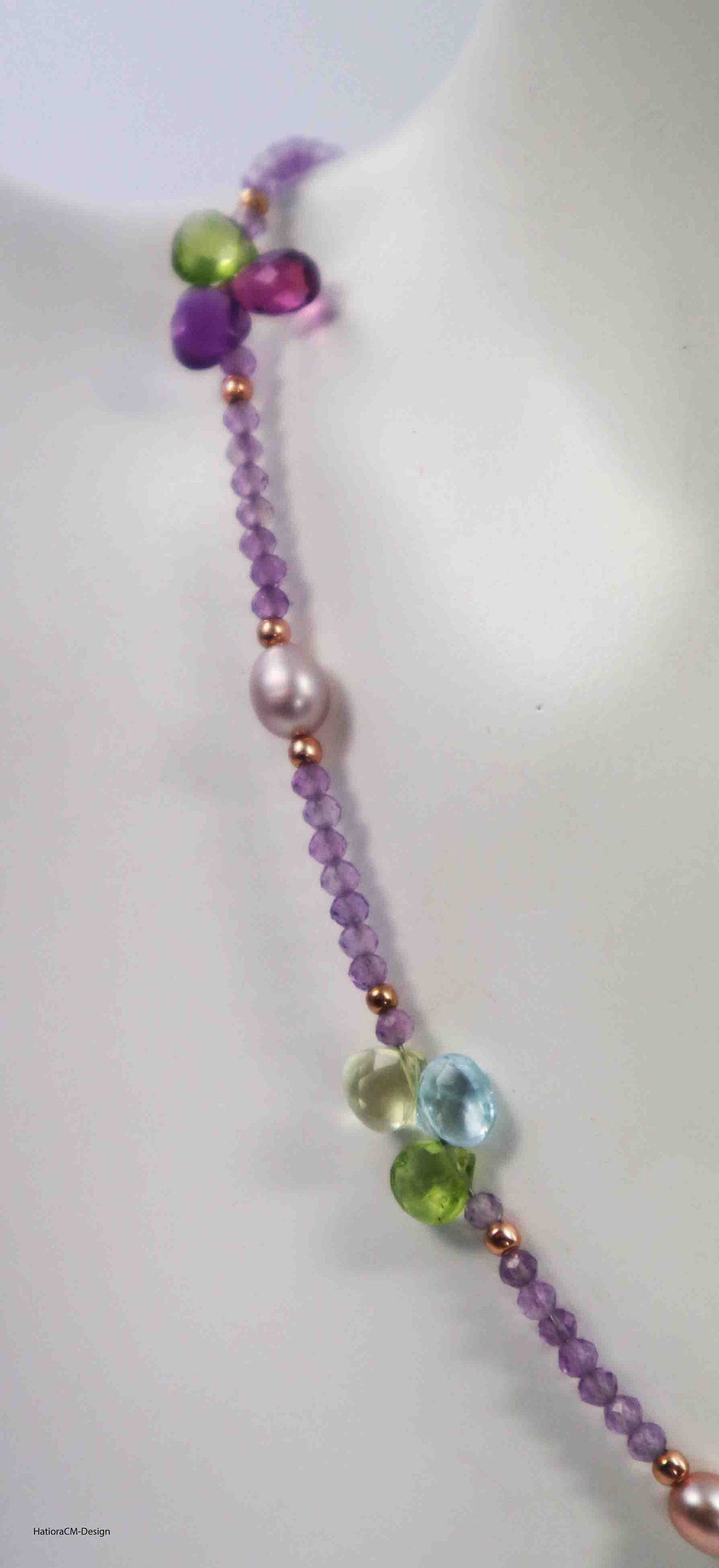 Amethyst Necklace with Peridot, Lemon Quartz, Sky Blue Topaz, Swiss Blue Topaz, Purple Amethyst, Purple Sapphire, 18 Karat Rose-Gold Vermeil with Intermediate Parts and Lobster Clasp in Silver 925 Gold Plated with Extension Chain; Length: 46 cm. Natural gemstones.
