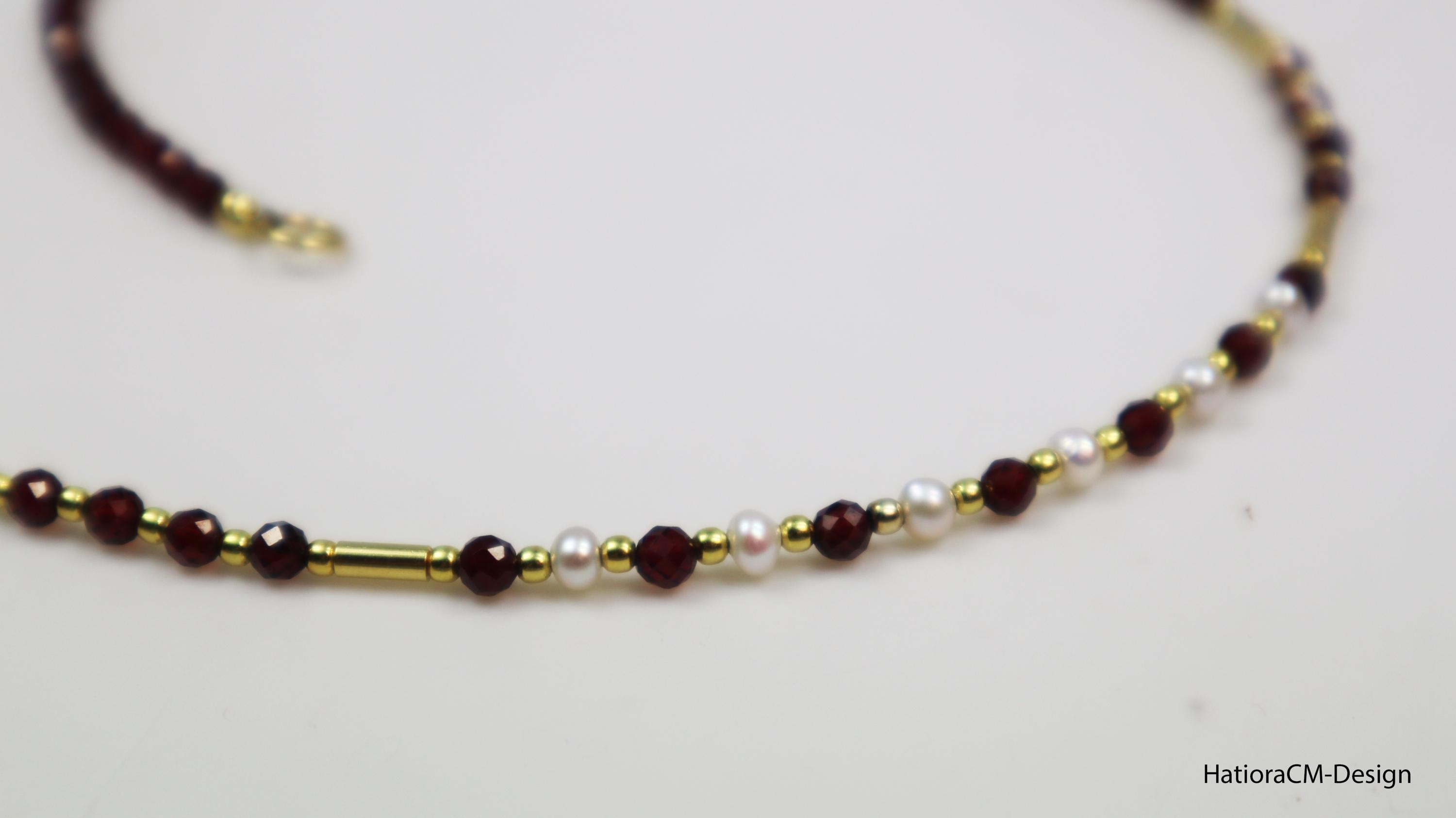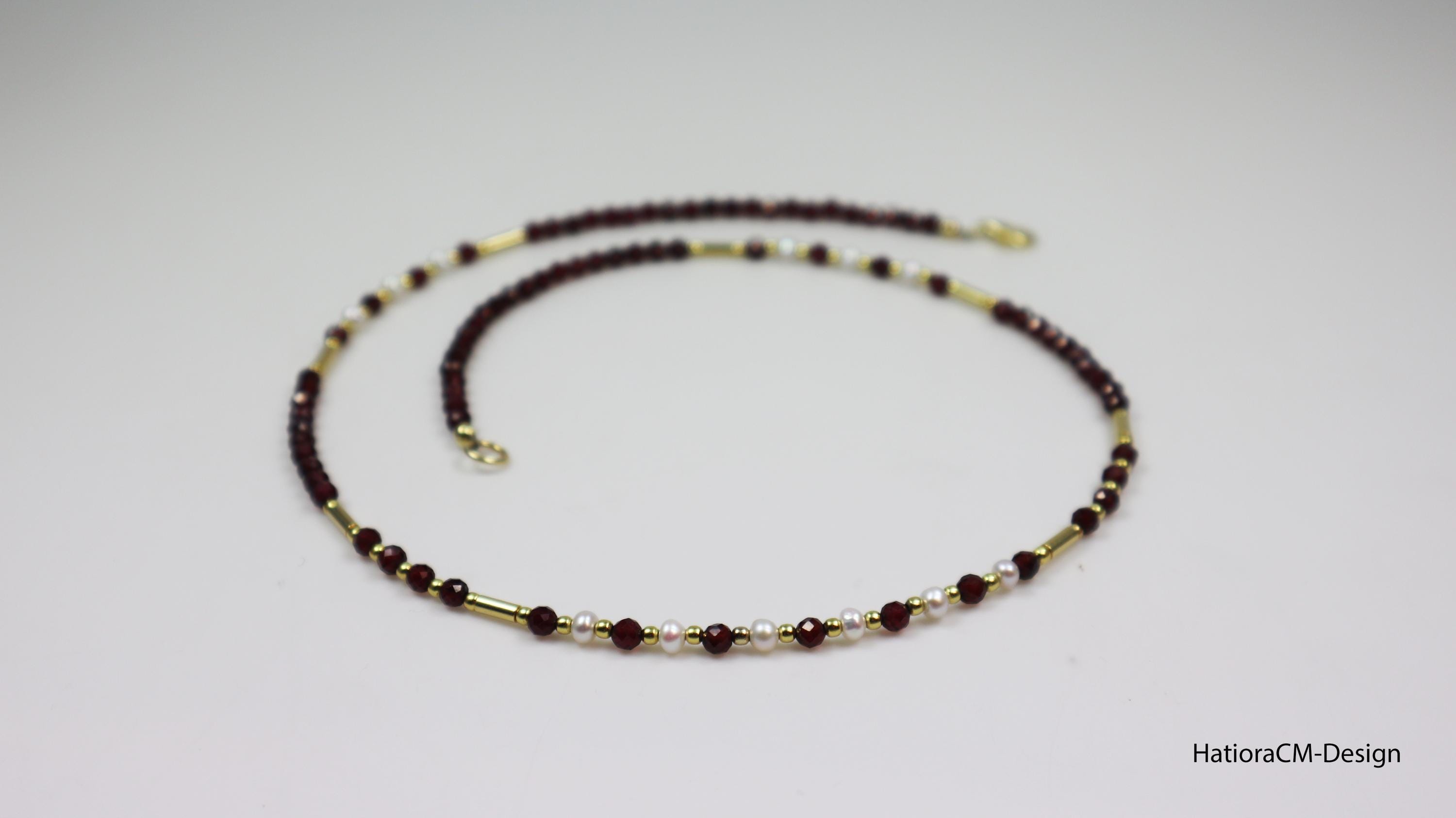 Garnet necklace with southwater pearls and gold-plated intermediate parts (silver 925), 45 cm; natural gemstones.