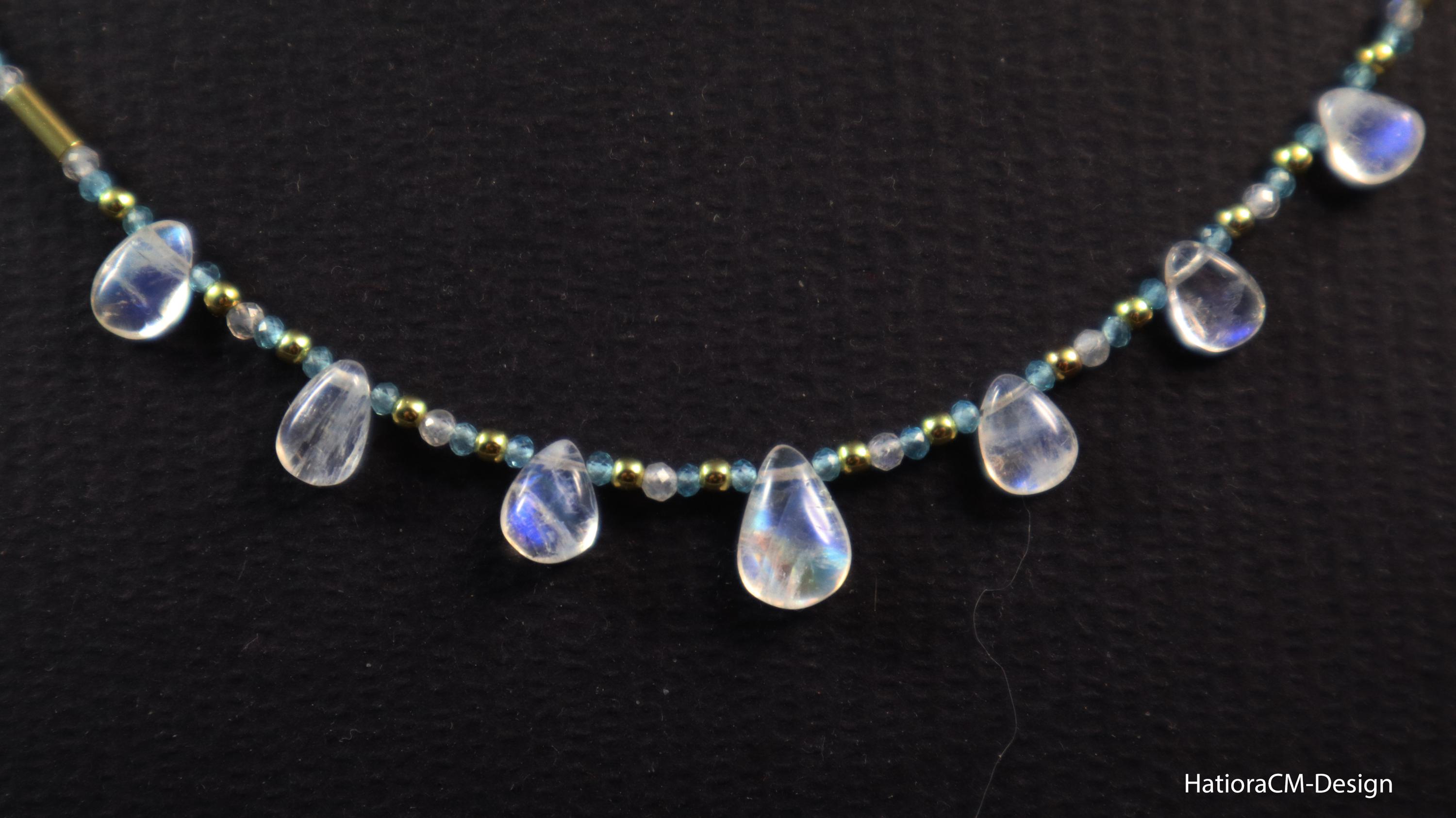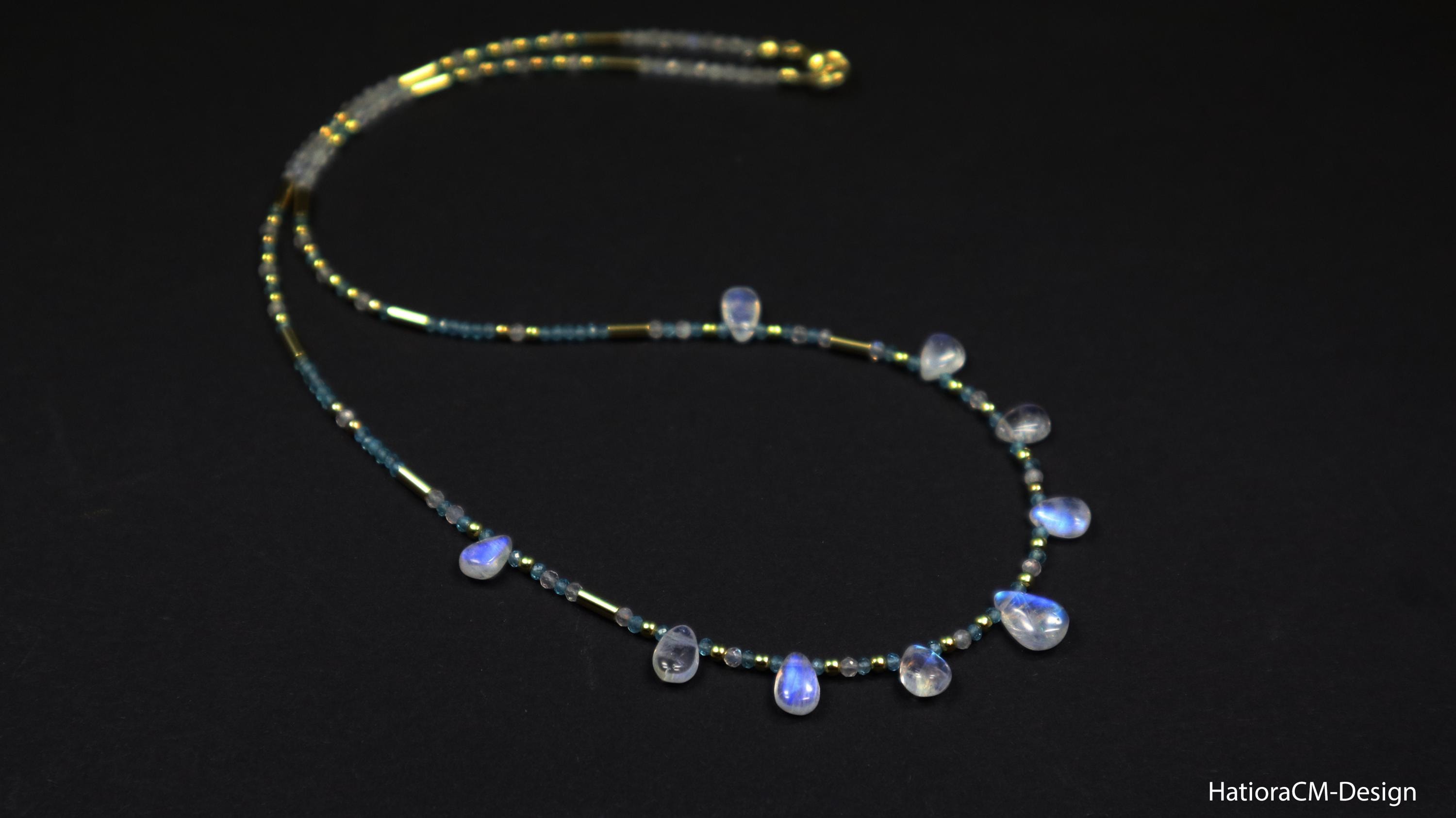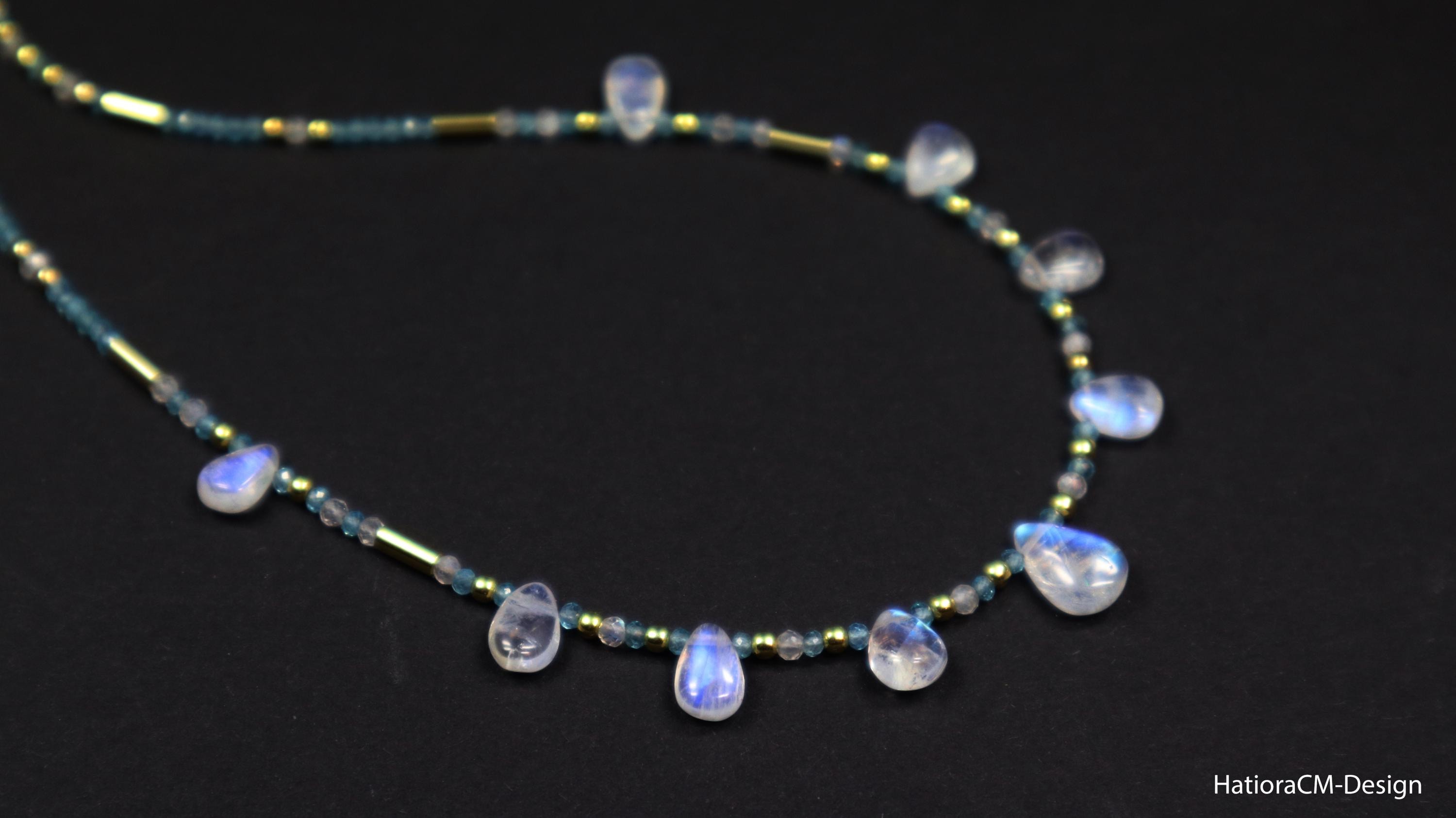 Moonstone necklace with moonstone briolettes, apatite and intermediate parts and carabiner clasp silver gold plated 925; natural gemstones.