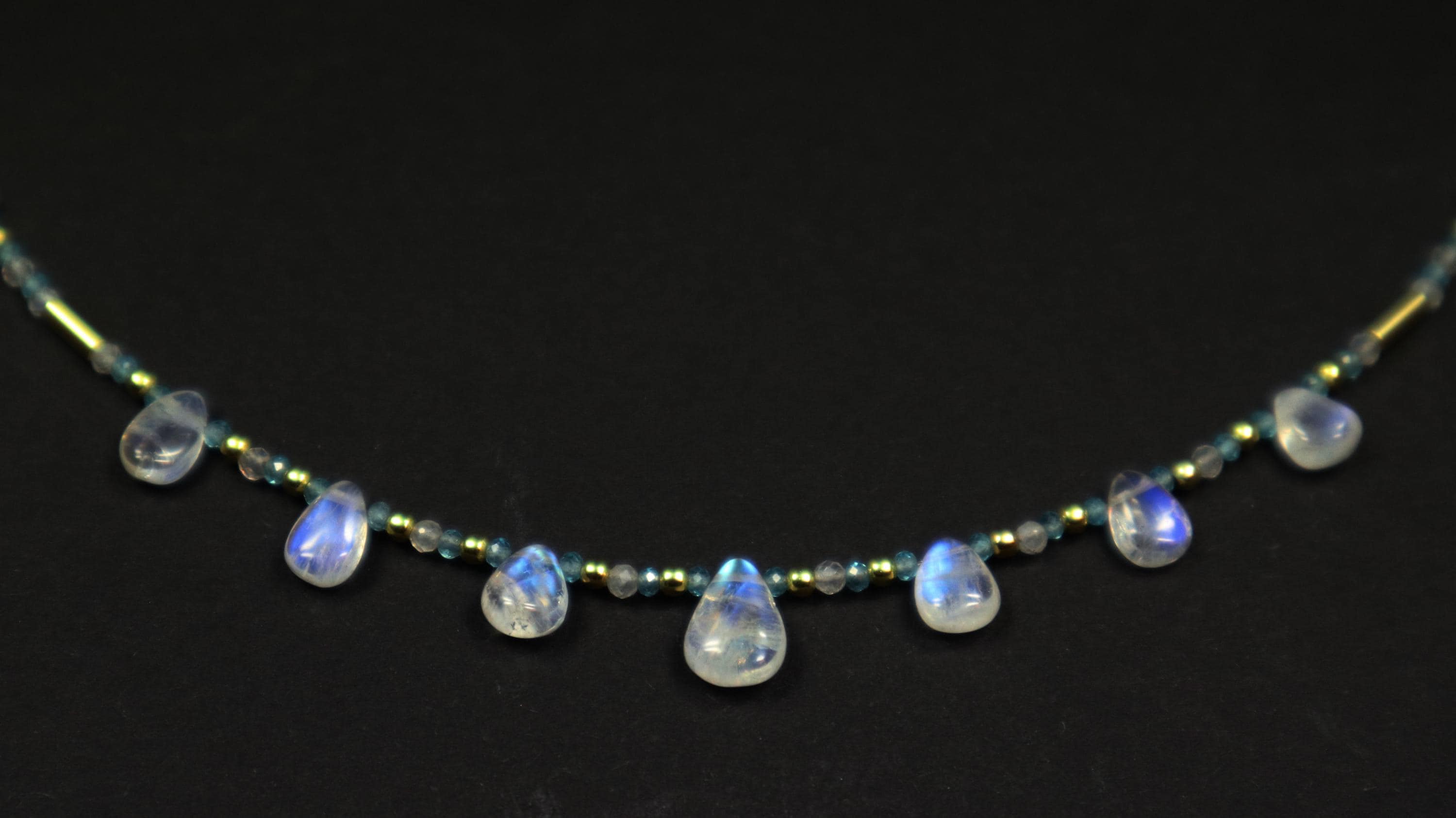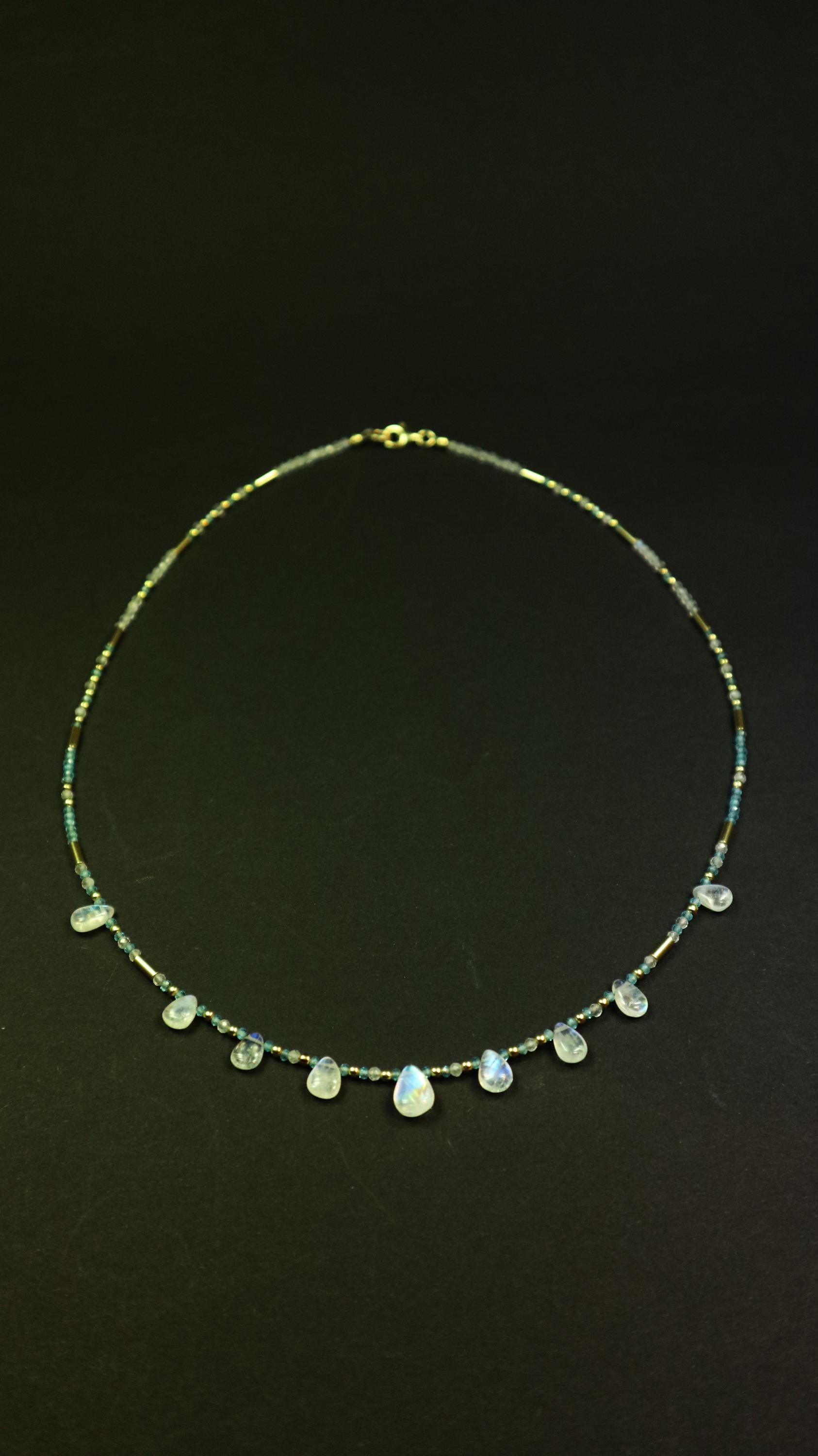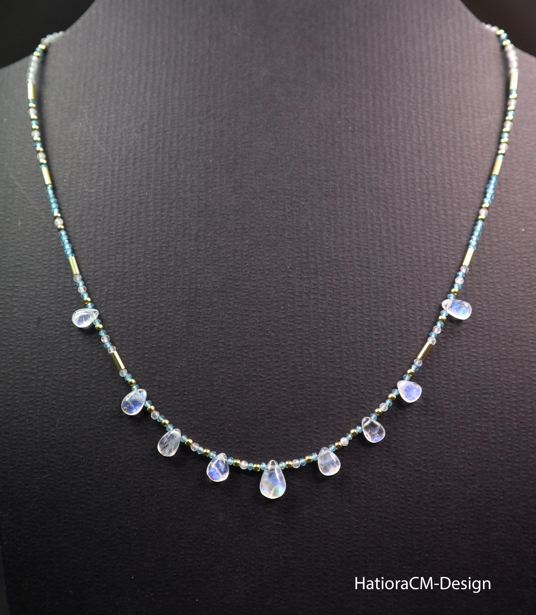 Moonstone necklace with moonstone briolettes, apatite and intermediate parts and carabiner clasp silver gold plated 925; natural gemstones.