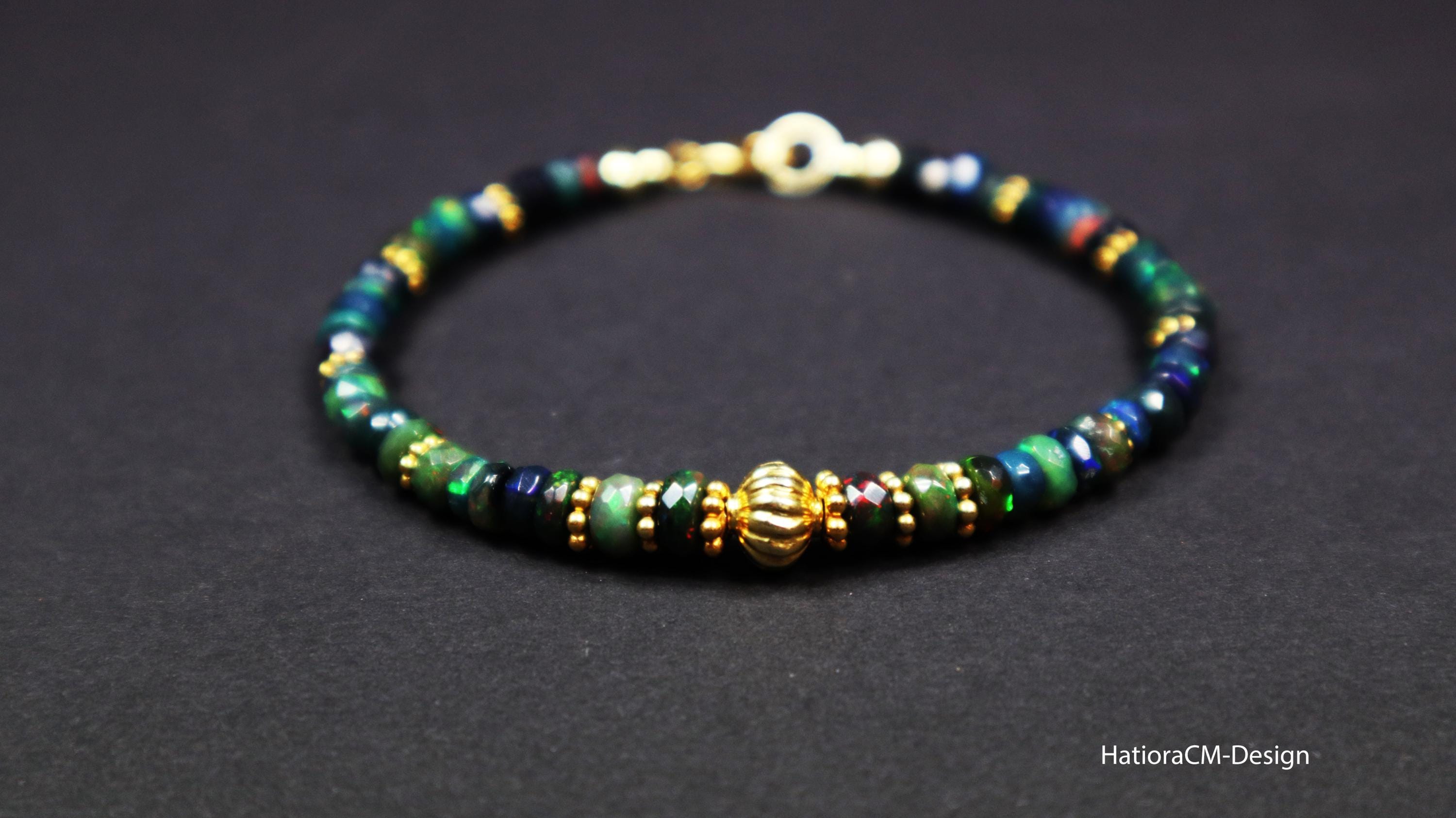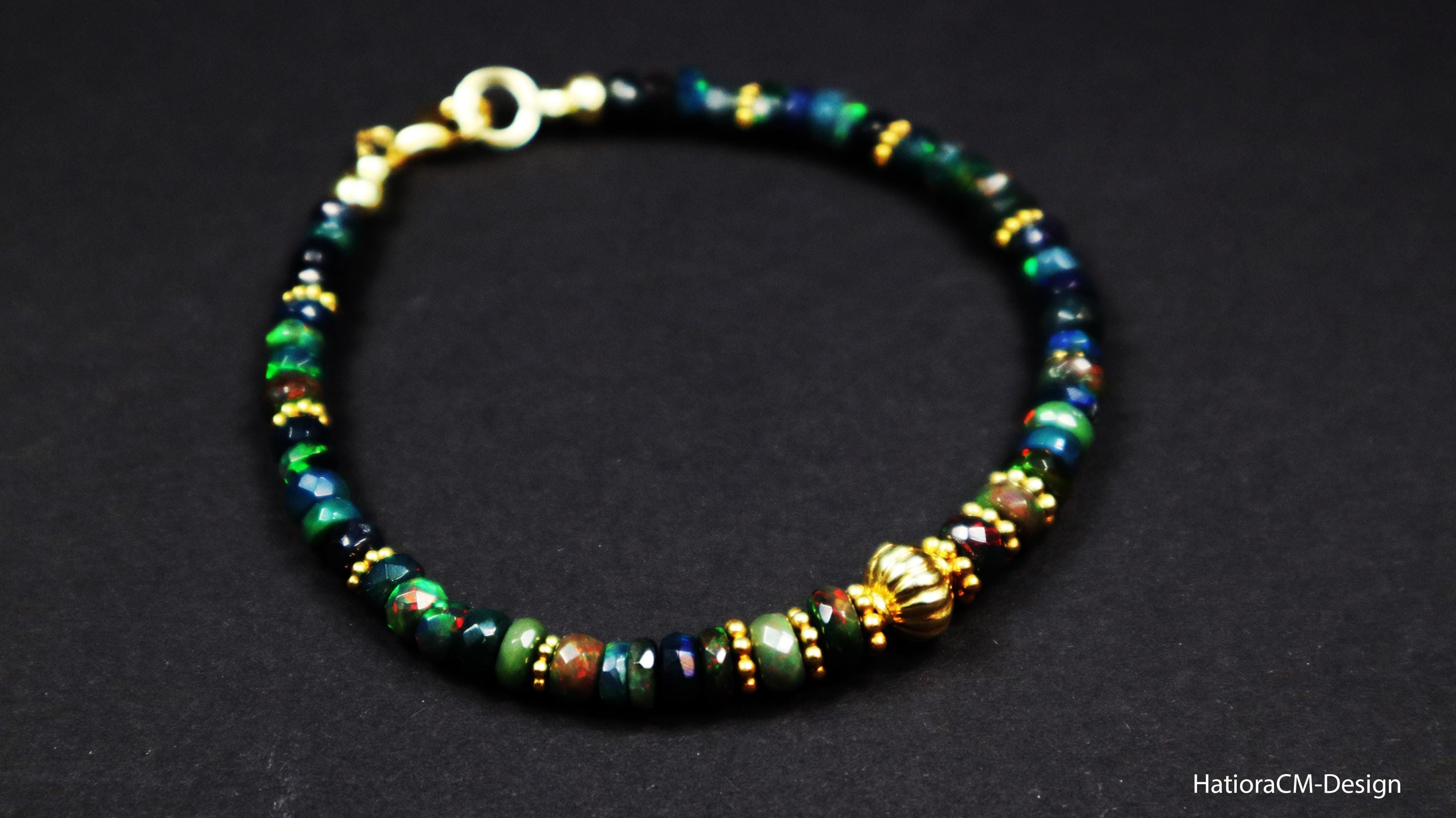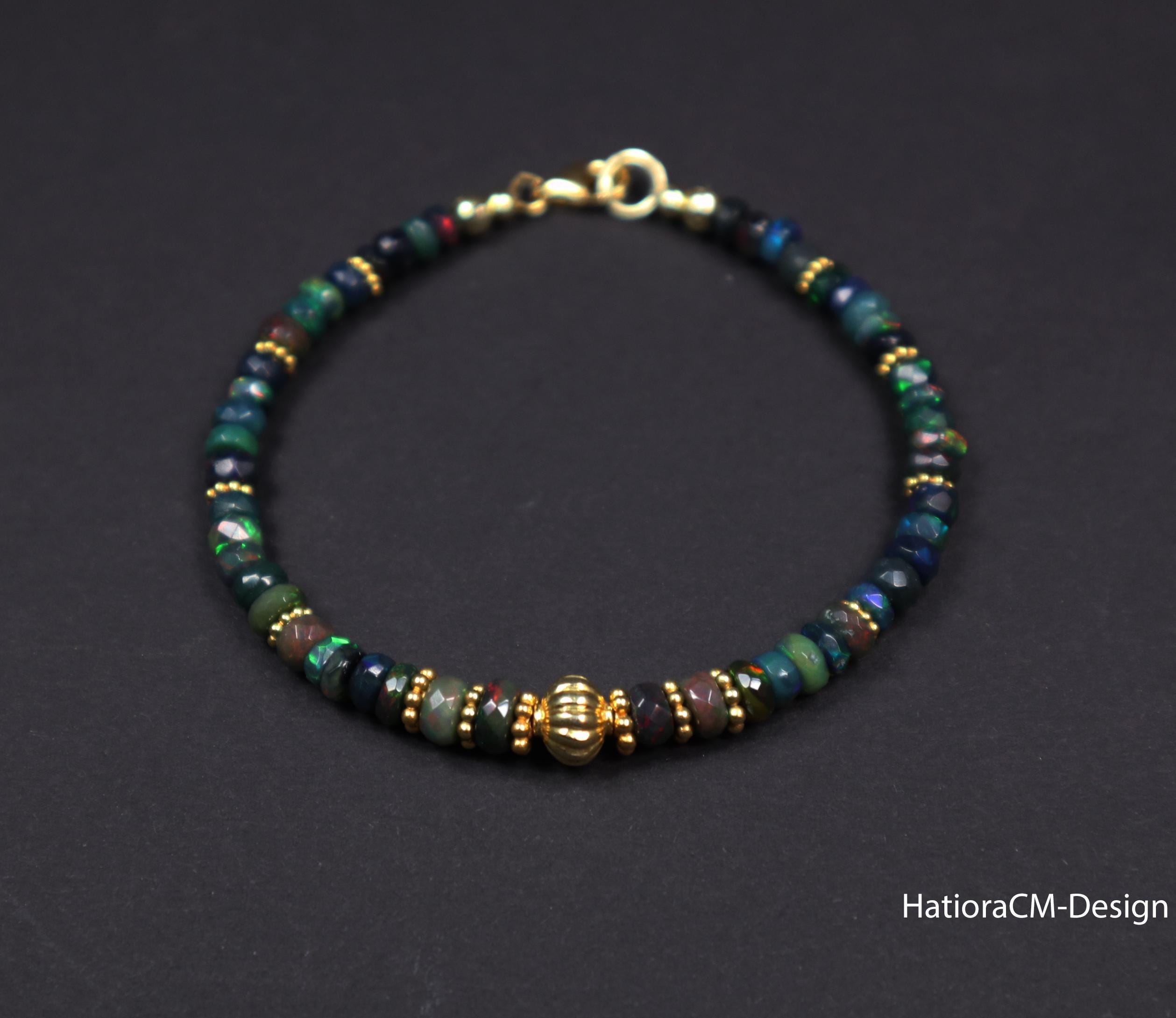 Bracelet with black ethiopian opals and gold-plated intermediate parts (silver 925), 45 cm; natural gemstones.