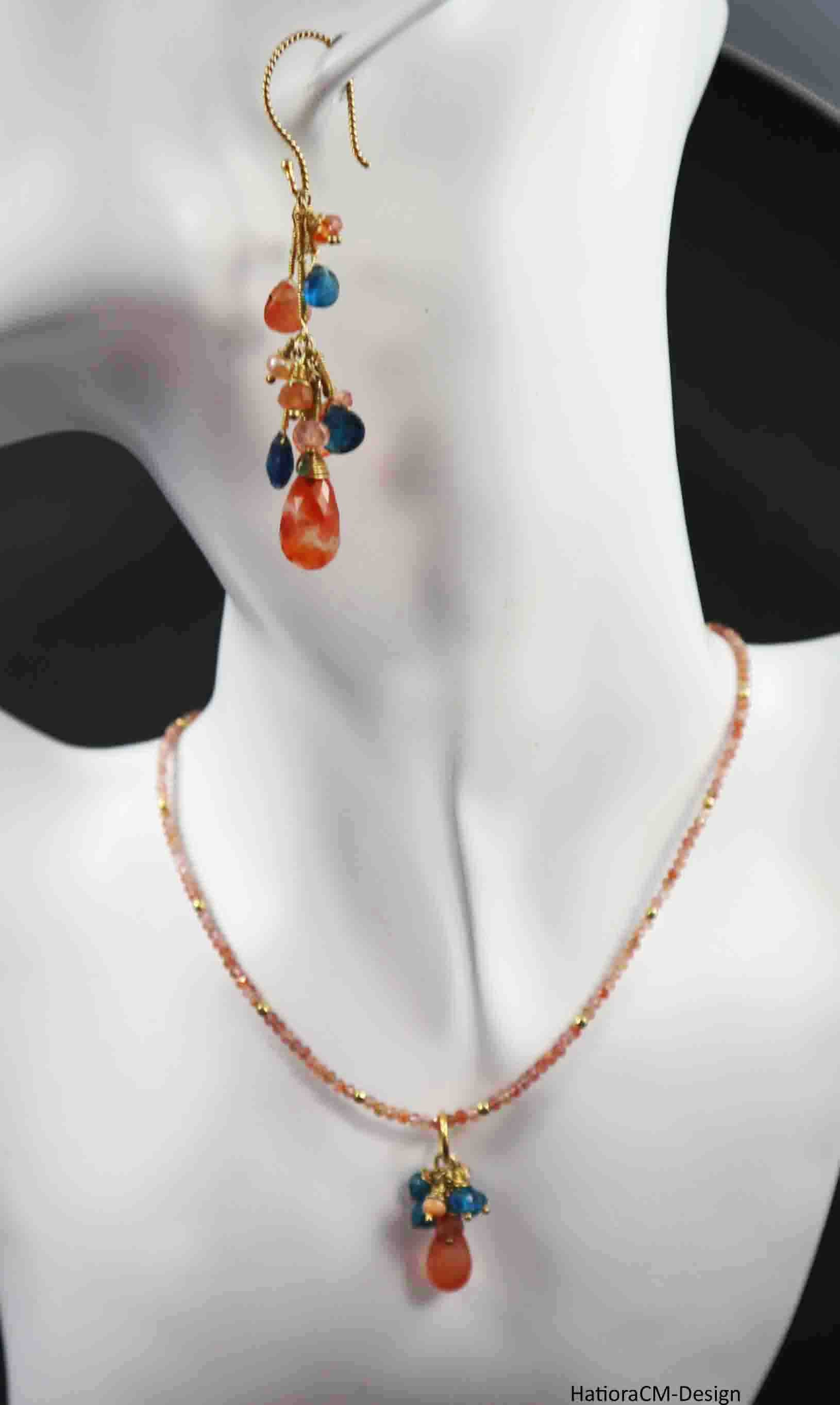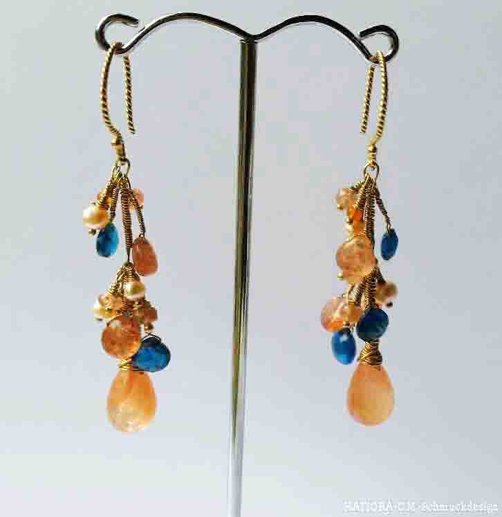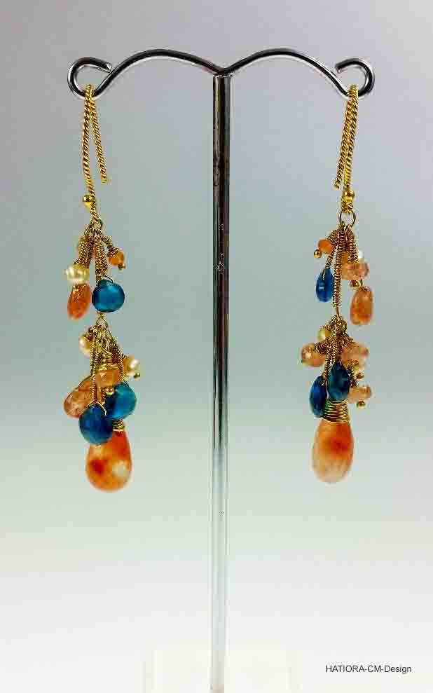 Chandelier earrings (1 pair) with copper rutilated quartz, sunstone, Pacific blue apatite, salmon-colored freshwater pearls, and fire opals in 24K gold (vermeil).