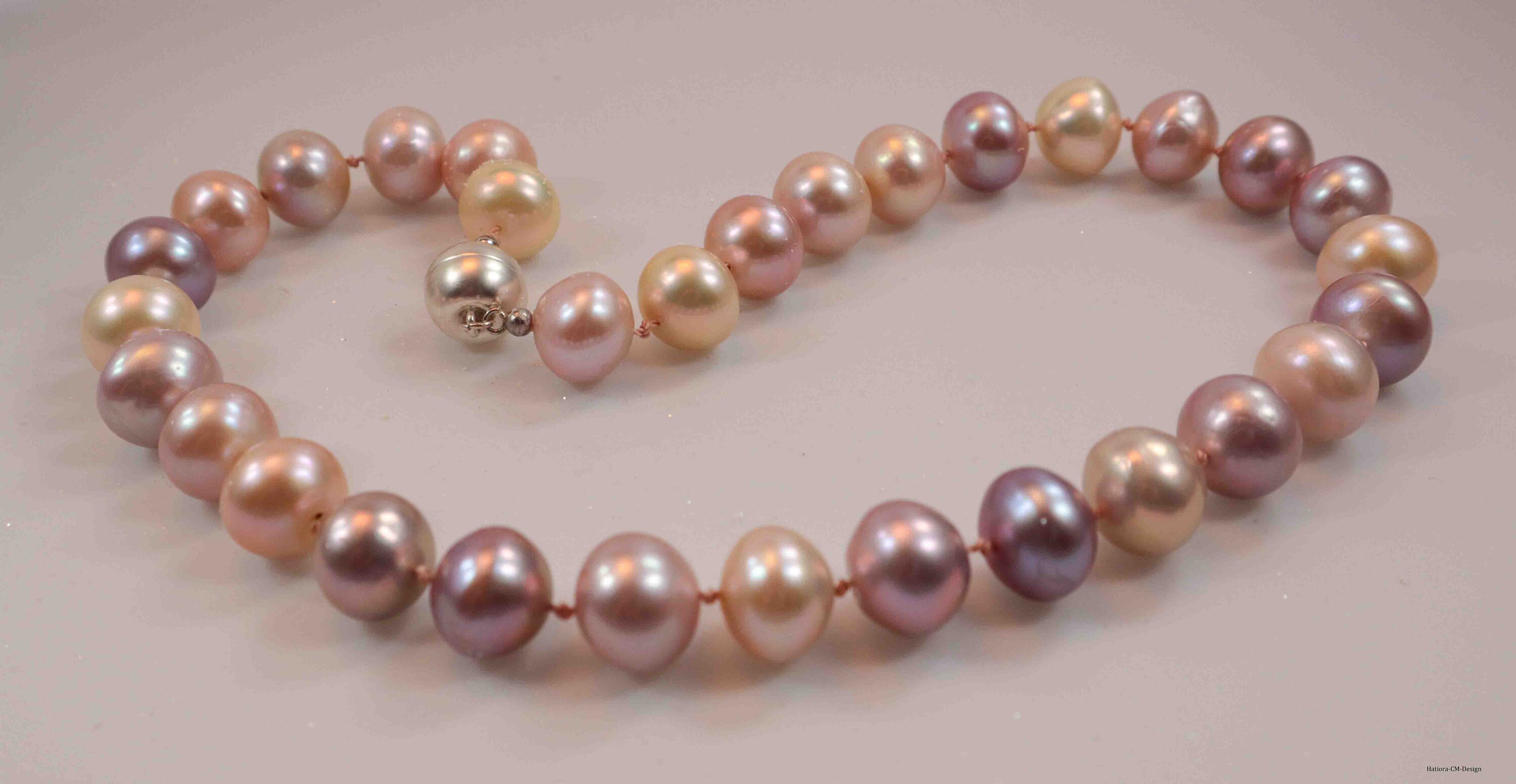 Multicolor hand-knotted Edison button pearl necklace with silver magnetic closure (925). Beautiful pearl necklace with silky shine of natural multicolor "button" pearls of the Pacific oyster.
